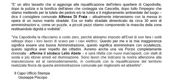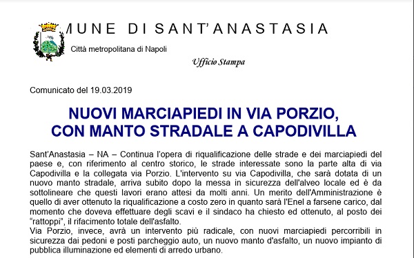 Questo il comunciato inviatoci dall'Ufficio Stampa del Comune di Sant'Anastasia.