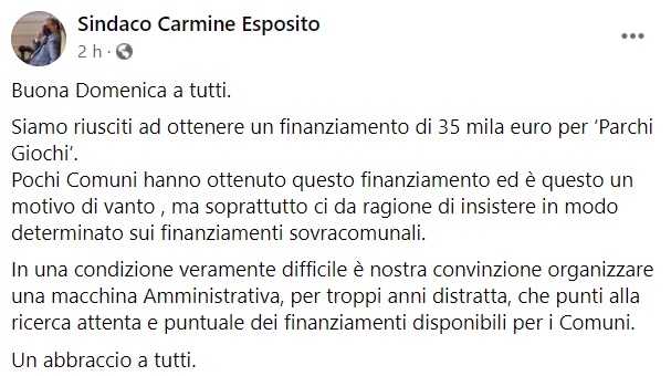 Questo quanto apprendiamo dalla pagina facebook del Sindaco Esposito: