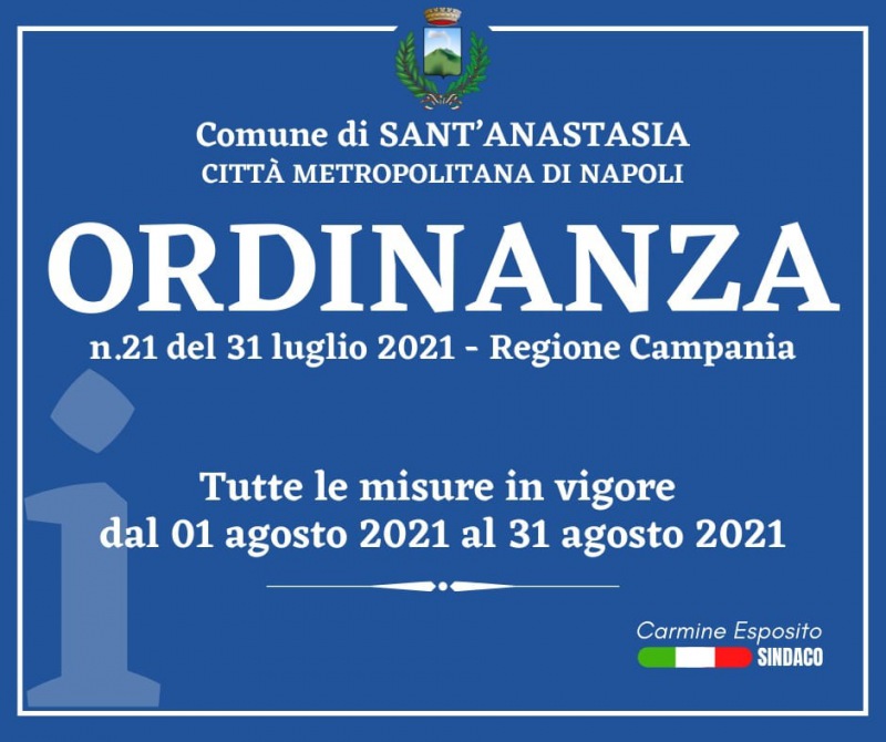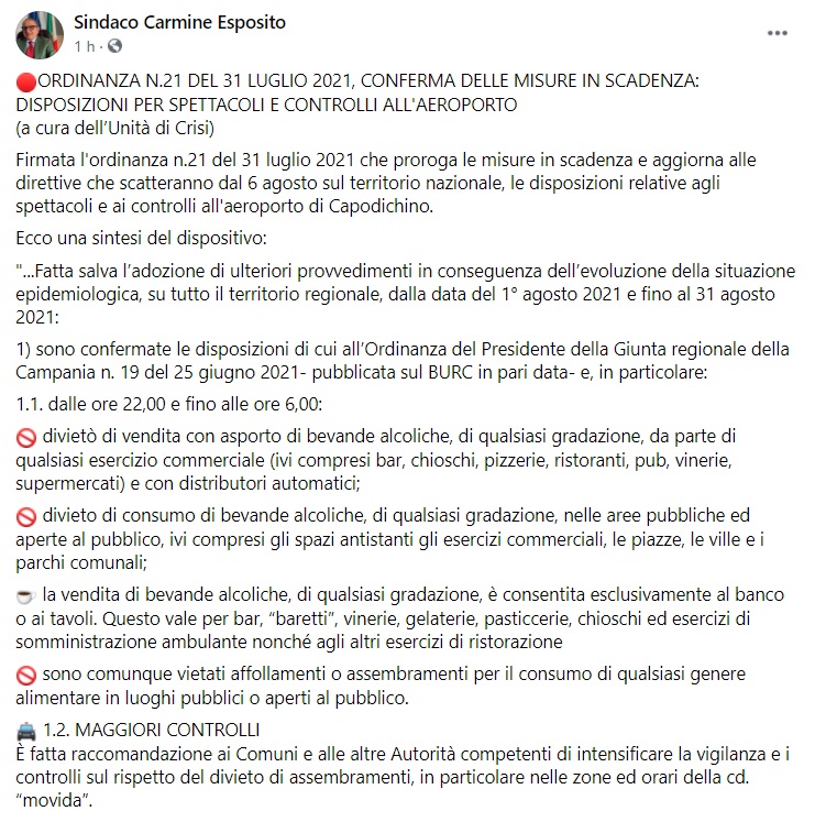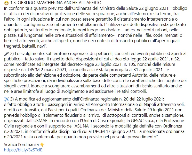 "Firmata l'ordinanza n.21 del 31 luglio 2021 che proroga le misure in scadenza e aggiorna alle direttive che scatteranno dal 6 agosto sul territorio nazionale, le disposizioni relative agli spettacoli e ai controlli all'aeroporto di Capodichino. Ecco una sintesi del dispositivo: "...Fatta salva l’adozione di ulteriori provvedimenti in conseguenza dell’evoluzione della situazione epidemiologica, su tutto il territorio regionale, dalla data del 1° agosto 2021 e fino al 31 agosto 2021: 1) sono confermate le disposizioni di cui all’Ordinanza del Presidente della Giunta regionale della Campania n. 19 del 25 giugno 2021- pubblicata sul BURC in pari data- e, in particolare: 1.1. dalle ore 22,00 e fino alle ore 6,00: -Si legge nella nota- divietò di vendita con asporto di bevande alcoliche, di qualsiasi gradazione, da parte di qualsiasi esercizio commerciale (ivi compresi bar, chioschi, pizzerie, ristoranti, pub, vinerie, supermercati) e con distributori automatici; divieto di consumo di bevande alcoliche, di qualsiasi gradazione, nelle aree pubbliche ed aperte al pubblico, ivi compresi gli spazi antistanti gli esercizi commerciali, le piazze, le ville e i parchi comunali; la vendita di bevande alcoliche, di qualsiasi gradazione, è consentita esclusivamente al banco o ai tavoli. Questo vale per bar, “baretti”, vinerie, gelaterie, pasticcerie, chioschi ed esercizi di somministrazione ambulante nonché agli altri esercizi di ristorazione sono comunque vietati affollamenti o assembramenti per il consumo di qualsiasi genere alimentare in luoghi pubblici o aperti al pubblico. 1.2. MAGGIORI CONTROLLI È fatta raccomandazione ai Comuni e alle altre Autorità competenti di intensificare la vigilanza e i controlli sul rispetto del divieto di assembramenti, in particolare nelle zone ed orari della cd. “movida”. 1.3. -Si legge nella nota- OBBLIGO MASCHERINA ANCHE ALL’APERTO In conformità a quanto previsto dall’Ordinanza del Ministro della Salute 22 giugno 2021, l’obbligo di utilizzo dei dispositivi di protezione delle vie respiratorie, anche all’esterno, resta fermo, tra l’altro, in ogni situazione in cui non possa essere garantito il distanziamento interpersonale o quando si configurino assembramenti o affollamenti. L’ utilizzo dei detti dispositivi resta pertanto obbligatorio, sul territorio regionale, in ogni luogo non isolato – ad es. nei centri urbani, nelle piazze, sui lungomari nelle ore e situazioni di affollamento- nonché nelle file, code, mercati o fiere ed altri eventi, anche all’aperto, nonché nei contesti di trasporto pubblico all'aperto quali traghetti, battelli, navi”. 2) Lo svolgimento, sul territorio regionale, di spettacoli, concerti ed eventi pubblici ed aperti al pubblico – fatto salvo il rispetto delle disposizioni di cui al decreto-legge 22 aprile 2021, n.52, come modificate ed integrate dal decreto-legge 23 luglio 2021, n. 105, nonché delle misure disposte dal DPCM 2 marzo 2021, la cui efficacia è stata prorogata al 31 agosto 2021- è subordinato alla definizione ed adozione, da parte delle competenti Autorità, delle misure e specifiche prescrizioni, da individualizzare sulla base delle concrete caratteristiche dei luoghi e dei singoli eventi, idonee a scongiurare assembramenti ed altre situazioni di rischio sanitario anche nelle aree limitrofe al luogo di svolgimento e ad assicurare i relativi controlli. -Si legge nella nota- 3) A modifica ed aggiornamento dell’Ordinanza regionale n. 20 del 22 luglio 2021: è fatto obbligo a tutti i passeggeri in arrivo all’Aeroporto Internazionale di Napoli attraverso voli, diretti o di transito, dai Paesi per i quali l’Ordinanza del Ministro della Salute 29 luglio 2021 non preveda l’obbligo di isolamento fiduciario all’arrivo, di sottoporsi ai controlli, anche a campione, organizzati dall’USMAF in raccordo con l’Unità di Crisi regionale, la GESAC s.p.a., e la Protezione Civile regionale e con il supporto dell’ASL NA 1 secondo le modalità già definite con Ordinanza n.20/2021, in conformità alla disciplina di cui al DPCM 17 giugno 2021. La menzionata ordinanza n.20/2021 resta confermata per quanto non previsto nel presente provvedimento". Scarica l’ordinanza https://bit.ly/3zSTxfE"