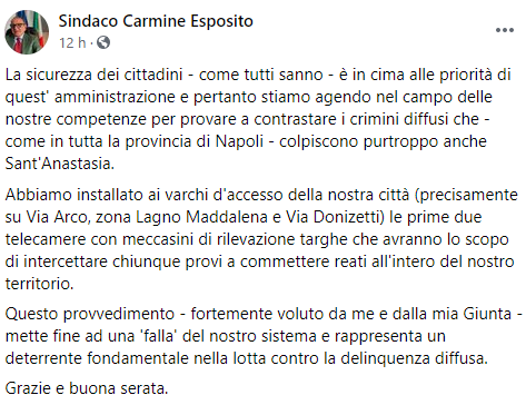 Questo il post pubblicato sulla sua pagina Facebook dal Sindaco di Sant'Anastasia Carmine Esposito: "La sicurezza dei cittadini - come tutti sanno - è in cima alle priorità di quest' amministrazione e pertanto stiamo agendo nel campo delle nostre competenze per provare a contrastare i crimini diffusi che - come in tutta la provincia di Napoli - colpiscono purtroppo anche Sant'Anastasia. Abbiamo - si legge nel post - installato ai varchi d'accesso della nostra città (precisamente su Via Arco, zona Lagno Maddalena e Via Donizetti) le prime due telecamere con meccasini di rilevazione targhe che avranno lo scopo di intercettare chiunque provi a commettere reati all'intero del nostro territorio. Questo provvedimento - fortemente voluto da me e dalla mia Giunta - mette fine ad una 'falla' del nostro sistema e rappresenta un deterrente fondamentale - conclude il post - nella lotta contro la delinquenza diffusa. Grazie e buona serata".