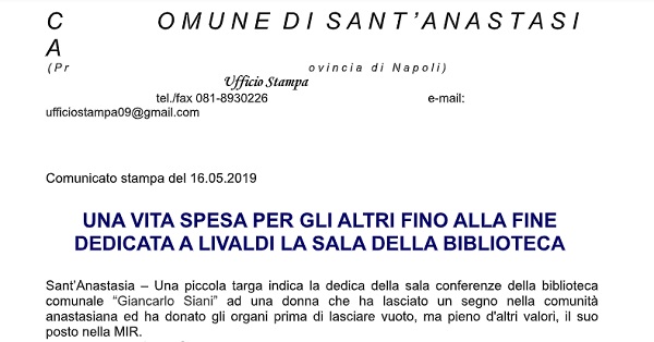 Questo il comunicato inviatoci dall'Ufficio Stampa del Comune di Sant'Anastasia.