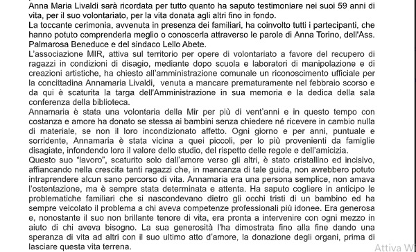 SANT'ANASTASIA. Una targa e la sala conferenze della biblioteca a ricordo di Annamaria Livaldi