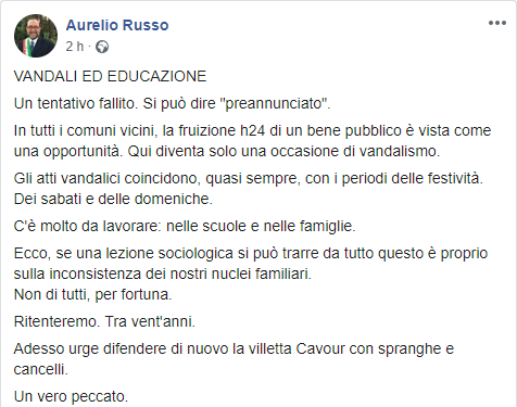 In tutti i comuni vicini, la fruizione h24 di un bene pubblico è vista come una opportunità. Qui diventa solo una occasione di vandalismo. Gli atti vandalici coincidono, quasi sempre, con i periodi delle festività. Dei sabati e delle domeniche. C'è molto da lavorare: nelle scuole e nelle famiglie. Ecco, se una lezione sociologica si può trarre da tutto questo è proprio sulla inconsistenza dei nostri nuclei familiari. Non di tutti, per fortuna. Ritenteremo. Tra vent'anni. Adesso urge difendere di nuovo la villetta Cavour con spranghe e cancelli. Un vero peccato."