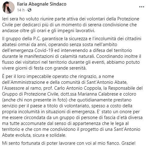 Questo il post pubblicato sulla sua pagina Facebook dal Sindaco di Sant'Antonio Abate Ilaria Abagnale: "Ieri sera ho voluto riunire parte attiva dei volontari della Protezione Civile per dedicarci più di un momento di serena condivisione che andasse oltre gli orari e gli impegni lavorativi. Il gruppo della P.C. garantisce la sicurezza e l’incolumità dei cittadini abatesi ormai da anni - si legge nel post - operando senza sosta nell'ambito dell'emergenza Covid-19 ed intervenendo a difesa del territorio durante le manifestazioni di calamità naturali. Coordinando inoltre il flusso dei visitatori nel territorio durante gli eventi, abbiamo potuto vivere giorni di festa con grande serenità. È per il loro impeccabile operato che ringrazio - si legge ancora - a nome dell’Amministrazione e della comunità di Sant’Antonio Abate, l’Assessore al ramo, prof. Carlo Antonio Coppola, la Responsabile del Gruppo di Protezione Civile, dott.ssa Marianna Calabrese e coloro (anche chi non presente in foto) che quotidianamente prestano servizio per il paese a titolo di volontariato - prosegue il post - spesso a costo della propria incolumità in situazioni di emergenza. E’ stato un onore per me essere circondata da un gruppo di persone di fascia d’età diversa ma tutte accomunate dal senso di appartenenza che le lega al territorio e che con me condividono il progetto di una Sant’Antonio Abate evoluta, sicura e solidale. Mi sento fortunata - conclude il post - di poter lavorare con voi al mio fianco. Grazie"!