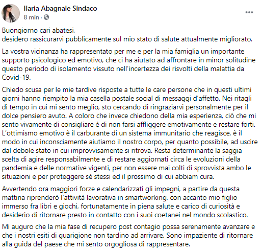 Questo il post pubblicato sulla sua pagina Facebook da Ilaria Abagnale, Sindaco di Sant'Antonio Abate: "Buongiorno cari abatesi,
