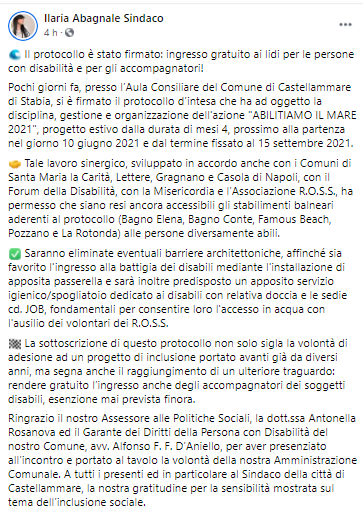 Questo il post pubblicato sulla sua pagina Facebook dal Sindaco di Sant'Antonio Abate Ilaria Abagnale: "Il protocollo è stato firmato: ingresso gratuito ai lidi per le persone con disabilità e per gli accompagnatori! Pochi giorni fa, presso l’Aula Consiliare del Comune di Castellammare di Stabia, si è firmato il protocollo d’intesa che ha ad oggetto la disciplina - si legge nel post - gestione e organizzazione dell'azione "ABILITIAMO IL MARE 2021", progetto estivo dalla durata di mesi 4, prossimo alla partenza nel giorno 10 giugno 2021 e dal termine fissato al 15 settembre 2021. Tale lavoro sinergico - si legge ancora nel post - sviluppato in accordo anche con i Comuni di Santa Maria la Carità, Lettere, Gragnano e Casola di Napoli, con il Forum della Disabilità, con la Misericordia e l’Associazione R.O.S.S., ha permesso che siano resi ancora accessibili gli stabilimenti balneari aderenti al protocollo (Bagno Elena, Bagno Conte, Famous Beach, Pozzano e La Rotonda) alle persone - prosegue il post - diversamente abili. Saranno eliminate eventuali barriere architettoniche, affinché sia favorito l'ingresso alla battigia dei disabili mediante l'installazione di apposita passerella e sarà inoltre predisposto un apposito servizio igienico/spogliatoio - prosegue il post - dedicato ai disabili con relativa doccia e le sedie cd. JOB, fondamentali per consentire loro l'accesso in acqua con l'ausilio dei volontari dei R.O.S.S. La sottoscrizione di questo protocollo - si legge ancora - non solo sigla la volontà di adesione ad un progetto di inclusione portato avanti già da diversi anni, ma segna anche il raggiungimento di un ulteriore traguardo: rendere gratuito l’ingresso anche degli accompagnatori dei soggetti disabili, esenzione mai prevista finora. Ringrazio il nostro Assessore alle Politiche Sociali, la dott.ssa Antonella Rosanova ed il Garante dei Diritti - prosegue ancora il post - della Persona con Disabilità del nostro Comune, avv. Alfonso F. F. D’Aniello, per aver presenziato all’incontro e portato al tavolo la volontà della nostra Amministrazione Comunale. A tutti i presenti ed in particolare al Sindaco della città di Castellammare - conclude il post - la nostra gratitudine per la sensibilità mostrata sul tema dell’inclusione sociale".