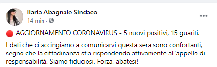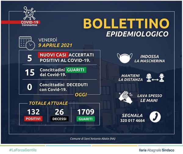 Questo parte del post pubblicato sulla sua pagina Facebook dal Sindaco di Sant'Antonio Abate Ilaria Abagnale: "I dati che ci accingiamo a comunicarvi questa sera sono confortanti, segno che la cittadinanza stia rispondendo attivamente all’appello di responsabilità. Siamo fiduciosi. Forza, abatesi! (...) ha scritto il Sindaco. Questi i dati: