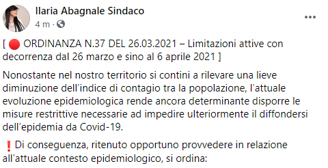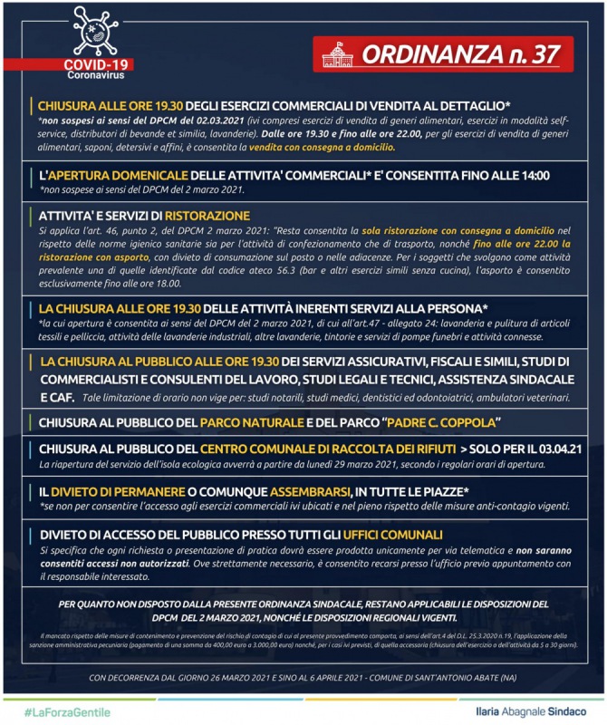 Questo parte del post pubblicato dal Sindaco di Sant'Antonio Abate Ilaria Abagnale sulla sua pagina Facebook: "Ordinanza N.37 del 26.03.2021 – Limitazioni attive con decorrenza dal 26 marzo e sino al 6 aprile 2021. Nonostante nel nostro territorio - si legge nel post - si contini a rilevare una lieve diminuzione dell’indice di contagio tra la popolazione, l’attuale evoluzione epidemiologica rende ancora determinante disporre le misure restrittive necessarie ad impedire ulteriormente il diffondersi dell’epidemia da Covid-19. Di conseguenza - continua il post - ritenuto opportuno provvedere in relazione all’attuale contesto epidemiologico, si ordina(...)"