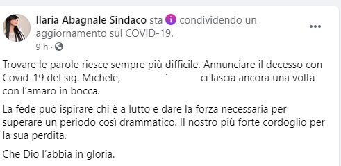 Ecco il post di cordoglio del Sindaco di Sant'Antonio Abate Ilaria Abagnale
