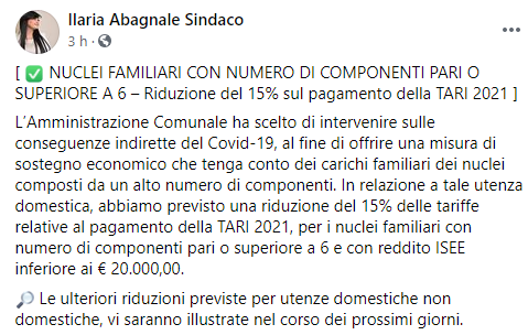 Questo il post pubblicato sulla sua pagina Facebook dal Sindaco di Sant'Antonio Abate Ilaria Abagnale sulla sua pagina Faebook: "Nuclei familiari con numero di componenti pari o superiore a 6. Riduzione del 15% sul pagamento della TARI 2021. L’Amministrazione Comunale - si legge nel post - ha scelto di intervenire sulle conseguenze indirette del Covid-19, al fine di offrire una misura di sostegno economico che tenga conto dei carichi familiari dei nuclei composti da un alto numero di componenti. In relazione a tale utenza - prosegue il post - domestica, abbiamo previsto una riduzione del 15% delle tariffe relative al pagamento della TARI 2021, per i nuclei familiari con numero di componenti pari o superiore a 6 e con reddito ISEE inferiore ai € 20.000,00. Le ulteriori riduzioni - conclude il post - previste per utenze domestiche non domestiche, vi saranno illustrate nel corso dei prossimi giorni".