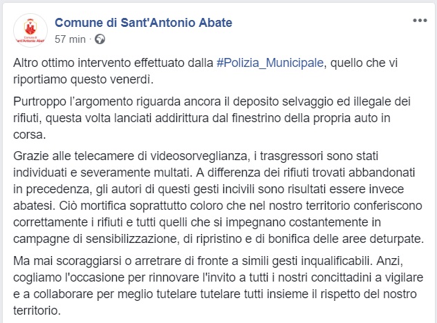 Questo quanto apprendiamo dalla pagina FB del Comune di Sant'Antonio Abate