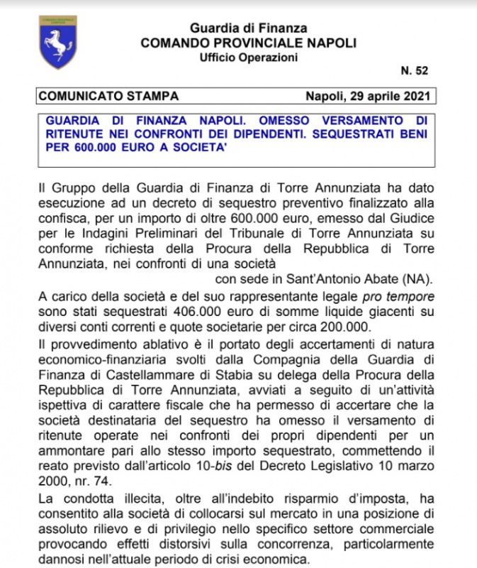Questa parte della nota stampa della Guardia di Finanza di Napoli: