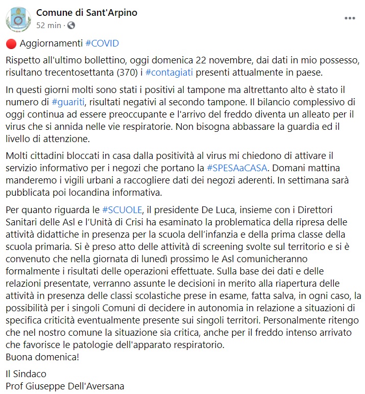 Questo quanto apprendiamo dalla pagina facebook del Comune di Sant'Arpino:
