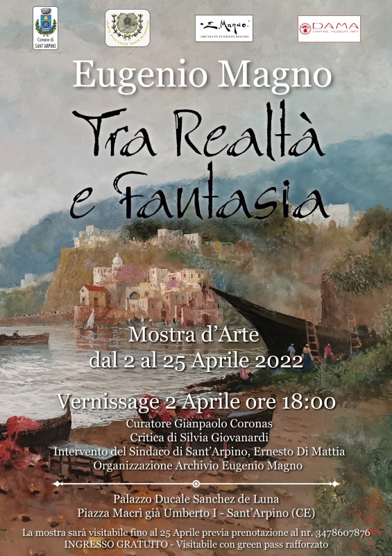 Questo il comunicato stampa diffuso dall'organizzazione della mostra personale di Eugenio Magno: "Un nuovo appuntamento con l%u2019arte animer� i locali della Pinacoteca 'Massimo Stanzione' sita nel Palazzo Ducale Sanchez De Luna di Sant%u2019Arpino (CE), che ospiter� dal 2 al 25 aprile 2022, la mostra personale di Eugenio Magno, dal titolo %u201CTra Realt� e Fantasia%u201D, scelto dal curatore dell%u2019iniziativa Gianpaolo Coronas. Le opere del Maestro�- si legge nel comunicato - che hanno come soggetto principalmente paesaggi Partenopei, rappresentano un perfetto equilibrio tra queste due dimensioni, da cui l%u2019autore estrapola fiabesche visioni dalle meravigliose vedute napoletane. Quando le atmosfere partenopee incontrano i pennelli, nascono sinfonie di colori nei cieli rannuvolati, nei riflessi marini, nelle sfumature della flora. Un lungo, caldo e lento respiro che si lascia vivere in tutta la sua produzione - prosegue il comunicato - di stampo impressionista. L%u2019artista nasce a Napoli nel 1944. Fortemente attratto dal paesaggismo dei grandi maestri partenopei dell%u2019Ottocento e del primo Novecento, si cimenta precocemente nel campo pittorico producendo opere di un certo rilievo artistico che vengono giudicate positivamente dal pittore Francesco Galante. Proprio Galante, cos� come Giuseppe Buono, Giacinto Gigante, Eduardo Dalbono, Giuseppe Casciaro possono considerarsi come i veri e propri Maestri putativi di Eugenio Magno. Attualmente - si legge ancora nel comunicato - vive e lavora a Napoli dove continua a dipingere e ad esercitare la sua professione di perito esperto di opere pittoriche del Novecento napoletano e di consulente tecnico per il restauro antico e moderno. L%u2019iniziativa � organizzata dal DamaMuseum, congiuntamente con l%u2019Archivio Eugenio Magno, e con la collaborazione dell%u2019Amministrazione Comunale di Sant%u2019Arpino e dall%u2019APS Pro Loco Sant%u2019Arpino. Al vernissage, in programma sabato 2 aprile�- recita ancora il comunicato - alle ore 18,00, interverr� Ernesto Di Mattia, Sindaco di Sant%u2019Arpino e la Dott.ssa Silvia Giovanardi, cui � affidata la critica della mostra. L%u2019ingresso all%u2019evento e alla mostra � gratuito, previa prenotazione e nel pieno rispetto delle vigenti normative e protocolli anti COVID-19. Sar� predisposto un catalogo della mostra".