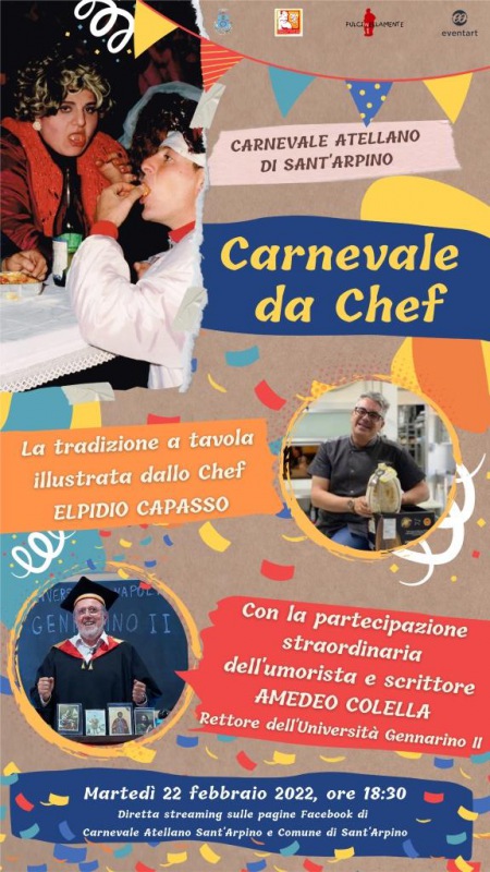 Questo il comunicato stampa diffuso dall'organizzazione del Carnevale Atellano di Sant'Arpino: "Carnevale da Chef: la tradizione a tavola illustrata dallo Chef atellano Elpidio Capasso". E' il tema del nuovo appuntamento del Carnevale Atellano di Sant'Arpino, che si terrà martedì prossimo, 22 febbraio, a partire dalle 18:30, in diretta streaming sulle pagine Facebook di "Carnevale Atellano Sant'Arpino" e "Comune di Sant'Arpino". L'incontro, coordinato da Elpidio Iorio - si legge nel comunicato - direttore di PulciNellaMente, sarà introdotto da Virginio Guida, Presidente del Comitato permanente per il Carnevale Atellano, e avrà come speciali ospiti la giornalista enogastronomica Antonella D'Avanzo, e l'umorista e scrittore Amedeo Colella, rettore dell'Università Gennarino II. Nel corso dell'appuntamento saranno raccontati aneddoti e curiosità sulla variegata tradizione gastronomica che caratterizza il Carnevale in Campania. Saranno proposte delle video ricette - si legge ancora - di alcune pietanze tipiche del periodo carnevalesco realizzate dallo chef Elpidio Capasso che vanta una lunga esperienza nel campo della ristorazione, coltivata sin da quando era un ragazzino. Aveva appena 13 anni, infatti, quando fu affascinato dalla cucina locale con i profumi e i colori che tutti gli alimenti regalano. Definito "l'allievo della ristorazione", in 29 anni ha avuto l'onore di collaborare con molti professionisti, abbracciando cosi - prosegue il comunicato - le varie tecniche di cottura, di conservazione, di taglio e tanto altro ancora. Oggi dopo un lungo viaggio fatto di conoscenza e ricerca (sulla carne e sul pesce), collabora con una struttura interamente balinese praticando cosi una cucina basata sulla disciplina del concetto vegetariano. Il suo motto è cucinare con gusto divertendosi. Di grande prestigio - si legge - anche l'altro ospite: Amedeo Colella, storico e umorista napoletano, autore di libri di successo, tra cui Manuale di Napoletanità, 1000 Quesiti di Napoletanità, Mangianapoli – 180 cose da mangiare a Napoli almeno una volta nella vita; Manuale Di Filosofia Napoletana; Mille Paraustielli di Cucina Napoletana. Curatore di alcuni libri gastronomici, tra cui - prosegue il comunicato - "Comme se magna a Nnatale"; "Comme se magna a Ppasca"; "La cucina afrodisiaca napoletana". Famose le sue "pillole di Napoletanità" da cui è nato un programma televisivo. Molto seguiti anche i suoi spettacoli di cui talvolta è autore e attore".