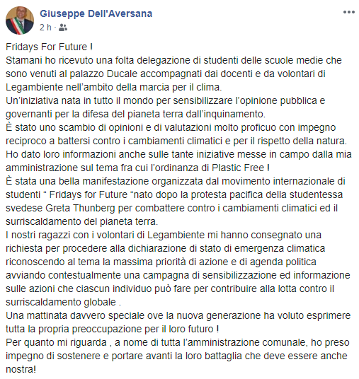 Questo il testo del post pubblicato su Facebook dal Sindaco di Sant'Arpino Giuseppe Dell'Aversana: