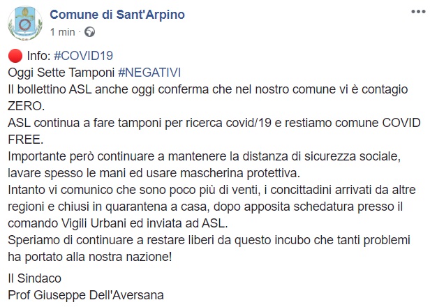 Questo quanto apprendiamo dalla pagina facebook del Comune di Sant'Arpino: