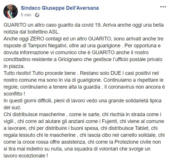 Questo parte di quanto pubblicato sulla pagina facebook del Sindaco Dell'Aversana: