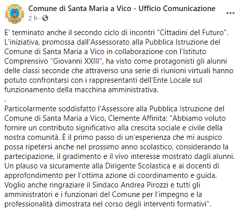 Dalla pagina Facebook 'Città di Santa Maria a Vico - Ufficio comunicazione': "E' terminato anche il secondo ciclo di incontri "Cittadini del Futuro". L'iniziativa, promossa dall'Assessorato alla Pubblica Istruzione del Comune di Santa Maria a Vico in collaborazione con l’Istituto Comprensivo “Giovanni XXIII", ha visto come protagonisti - si legge nel post - gli alunni delle classi seconde che attraverso una serie di riunioni virtuali hanno potuto confrontarsi con i rappresentanti dell'Ente Locale sul funzionamento della macchina amministrativa. Particolarmente soddisfatto l'Assessore alla Pubblica Istruzione del Comune di Santa Maria a Vico, Clemente Affinita: "Abbiamo voluto fornire un contributo significativo alla crescita sociale e civile della nostra comunità. È il primo passo - prosegue il post - di un’esperienza che mi auspico possa ripetersi anche nel prossimo anno scolastico, considerando la partecipazione, il gradimento e il vivo interesse mostrato dagli alunni. Un plauso va sicuramente alla Dirigente Scolastica e ai docenti di approfondimento per l’ottima azione di coordinamento e guida. Voglio anche ringraziare - si legge ancora - il Sindaco Andrea Pirozzi e tutti gli amministratori e i funzionari del Comune per l’impegno e la professionalità dimostrata nel corso degli interventi formativi".