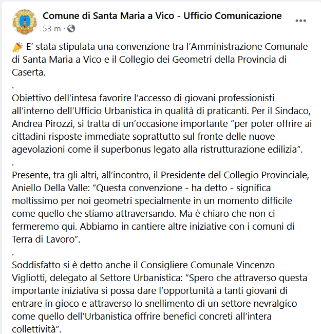Questo il post pubblicato sulla pagina Facebook del Comune di Santa Maria a Vico: "E’ stata stipulata una convenzione tra l’Amministrazione Comunale di Santa Maria a Vico e il Collegio dei Geometri della Provincia di Caserta. Obiettivo dell’intesa - precisa il post - favorire l’accesso di giovani professionisti all’interno dell’Ufficio Urbanistica in qualità di praticanti. Per il Sindaco, Andrea Pirozzi, si tratta di un’occasione importante “per poter offrire ai cittadini risposte immediate soprattutto sul fronte delle nuove agevolazioni come il superbonus legato alla ristrutturazione edilizia”. Presente, tra gli altri, all’incontro, il Presidente del Collegio Provinciale, Aniello Della Valle: “Questa convenzione - ha detto - significa moltissimo per noi geometri specialmente in un momento difficile come quello che stiamo attraversando. Ma è chiaro - prosegue il post - che non ci fermeremo qui. Abbiamo in cantiere altre iniziative con i comuni di Terra di Lavoro”. Soddisfatto si è detto anche il Consigliere Comunale Vincenzo Vigliotti, delegato al Settore Urbanistica: “Spero - conclude - che attraverso questa importante iniziativa si possa dare l’opportunità a tanti giovani di entrare in gioco e attraverso lo snellimento di un settore nevralgico come quello dell’Urbanistica offrire benefici concreti all’intera collettività”.