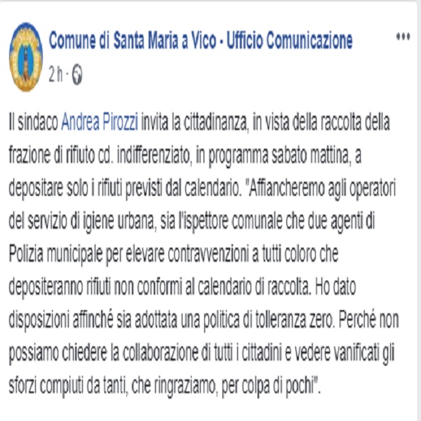 Questo il post pubblicato sulla pagina fb 'Comune di Santa Maria a Vico - Ufficio Comunicazione'