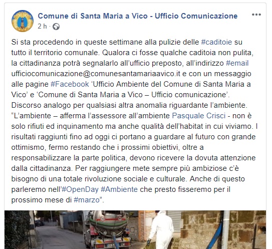 La cittadinanza può segnalare le caditoie della città non pulite, così come apprendiamo dalla pagina Facebook del Comune di Santa Maria a Vico.