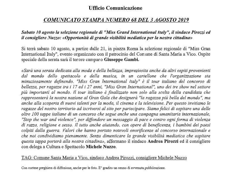 Di seguito, il testo del comunicato sulle selezioni Miss Grand International Italy a Santa Maria a Vico, giunto in redazione.