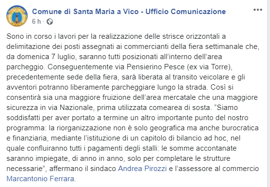 Questo il post pubblicato sulla pagina Facebook del Comune di Santa Maria a Vico: