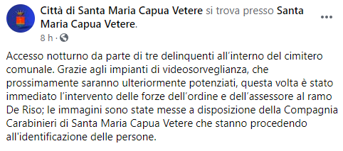 Questo il post pubblicato sulla pagina Facebook 'Città di Santa Maria Capua Vetere': "Accesso notturno da parte di tre delinquenti all’interno del cimitero comunale. Grazie agli impianti di videosorveglianza, che prossimamente saranno ulteriormente potenziati, questa volta - si legge nel post - è stato immediato l’intervento delle forze dell’ordine e dell’assessore al ramo De Riso; le immagini sono state messe a disposizione della Compagnia Carabinieri di Santa Maria Capua Vetere che stanno procedendo all'identificazione delle persone".
