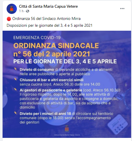 Questo il post pubblicato sulla pagina Facebook 'Città di Santa Maria Capua Vetere': "Ordinanza 56 del Sindaco Antonio Mirra Disposizioni per le giornate del 3, 4 e 5 aprile 2021"