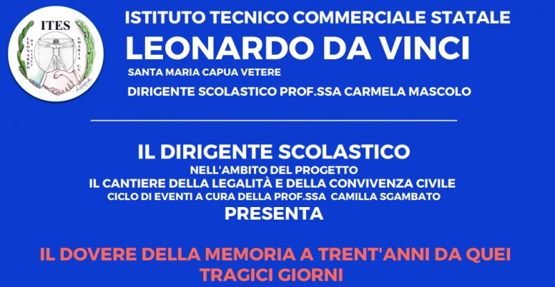 Questo il comunicato stampa diffuso dall'Ites Da Vinci di Santa Maria Capua Vetere: "Il dovere della memoria a trent'anni da quei tragici giorni” è il tema dell’iniziativa per ricordare Falcone, Borsellino gli uomini e le donne della scorta, promossa per domani, venerid 20, con inizio alle ore 10, dall’ITES Leonardo Da Vinci di Santa Maria Capua Vetere, guidato dalla dirigente scolastica Carmen Mascolo. Nell’ambito del ciclo di incontri - si legge nel comunicato - de “Il cantiere della Legalità e della convivenza civile”, curato dalla docente Camilla Sgambato, nell’aula magna dell’istituto domani mattina si confronteranno Sandro Ruotolo, senatore della Repubblica, Rosaria Capacchione, giornalista e già senatrice della Repubblica, e Francesco Petrillo, avvocato e presidente della Camera Penale di Santa Maria Capua Vetere. Ad accogliere gli illustri ospiti sarà la preside Maswcolo che aprirà I lavori con un salute di benvenuto prima degli interventi coordinate da Sgambato - si legge ancora - anch’ella già parlamentare della Repubblica. “La scuola ha davanti a sè la sfida più difficile, ma anche più esaltante, quella di formare cittadini consapevoli, pienamente inseriti nella comunità in cui vivono e pronti ad affrontare le sfide che la vita presenterà loro. Ringrazio tutte le autorevoli personalità che prontamente hanno risposto al nostro invito - conclude il comunicato - nella certezza che la scuola è il primo presidio di legalità ed il principale cantiere per la costruzione della cittadinanza attiva e consapevole”, afferma la dirigente dell’Ites Da Vinci, Mascolo".