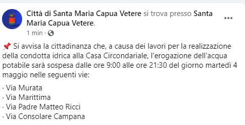 Questo il post pubblicato sulla pagina Facebook 'Città di Santa Maria Capua Vetere': "Si avvisa la cittadinanza che, a causa dei lavori per la realizzazione della condotta idrica alla Casa Circondariale, l'erogazione dell'acqua potabile - si legge nel post - sarà sospesa dalle ore 9:00 alle ore 21:30 del giorno martedì 4 maggio nelle seguenti vie: Via Murata, Via Marittima, Via Padre Matteo Ricci, Via Consolare Campana"