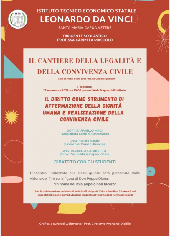Questo il comunicato stampa diffuso dall'Ites Da Vinci di Santa Maria Capua Vetere: "Parte il ciclo di incontri “Il cantiere della Legalità e della convivenza civile” presso l’ITES Leonardo Da Vinci di Santa Maria Capua Vetere, guidato dalla dirigente scolastica Carmen Mascolo. Il programma di iniziative - si legge nel comunicato - curato dalla docente Camilla Sgambato, è rivolto agli studenti dell’istituto, ed è stato costruito in sinergia con il territorio, le associazioni, l’amministrazione comunale, l’Università e le altre scuole della città. “È questa la vera mission della scuola, formare cittadini consapevoli, pienamente inseriti nella comunità in cui vivono e pronti ad affrontare le sfide che la vita presenterà loro. Ringrazio tutte le autorevoli personalità che prontamente hanno risposto al nostro invito, nella certezza che la scuola - prosegue il comunicato - è il primo presidio di legalità e cantiere per la costruzione della cittadinanza attiva e consapevole”, afferma la dirigente Mascolo. Il primo incontro è previsto per lunedì 22 alle ore 10, con il giudice di Cassazione Raffaello Magi che dialogherà con gli studenti, insieme al sindaco di Casal di Principe Renato Natale e all’avvocatessa Rossella Calabritto, sulla figura di Don Peppe Diana, quale simbolo ed esempio del coraggio - si legge ancora - e della rinascita della nostra provincia. Il secondo appuntamento ci sarà giovedì 25, in occasione della Giornata internazionale per l'eliminazione della violenza contro le donne, con l’inaugurazione della panchina rossa dipinta dagli studenti, nel cortile dell’istituto, alla presenza di autorità, Università e associazioni. Nel corso dei prossimi mesi - recita ancora il comunicato - l’ITES Da Vinci ospiterà Paolo Siani, Elena Ferrara, Rita Raucci, Rosario Esposito La Rossa, Massimo Recalcati, Paolo Albano, Gianluca Guida, Samuele Ciambriello e tanti altri. Nell’ambito del cantiere, i ragazzi si recheranno presso la Locanda del Gigante (comunità per tossicodipendenti) ed il centro Annalisa Durante a Forcella. Quindi, assisteranno ad alcune udienze in Corte d’Assise presso il Tribunale di Santa Maria Capua Vetere - prosegue il comunicato - e visiteranno zziende di riciclo della plastica. “Ringrazio gli studenti, tutto lo staff, i docenti, il personale ATA, i genitori, l’intero consiglio d’istituto, le autorità civili e religiose che hanno contribuito a realizzare un progetto così ambizioso, che ha potuto vedere la luce proprio perché la scuola ha chiara la sua visione - conclude il comunicato - ed è una vera comunità educante”, conclude la Dirigente Mascolo".