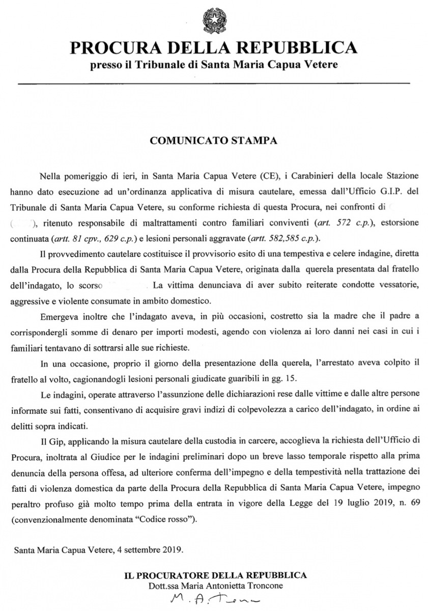 Questo parte del testo della nota inviataci dalla Procura della Repubblica presso il Tribunale di Santa Maria Capua Vetere