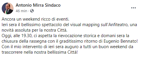 Questo il post pubblicato sulla sua pagina Facebook dal Sindaco di Santa Maria Capua Vetere Antonio Mirra: "Ancora un weekend ricco di eventi. Ieri sera il bellissimo spettacolo del visual mapping sull'Anfiteatro, una novità assoluta per la nostra Città. Oggi, alle 19.30, ci aspetta la rievocazione storica e domani sera - si legge nel post - la chiusura della rassegna con il graditissimo ritorno di Eugenio Bennato! Con il mio intervento di ieri sera auguro a tutti un buon weekend da trascorrere nella nostra bellissima Città".