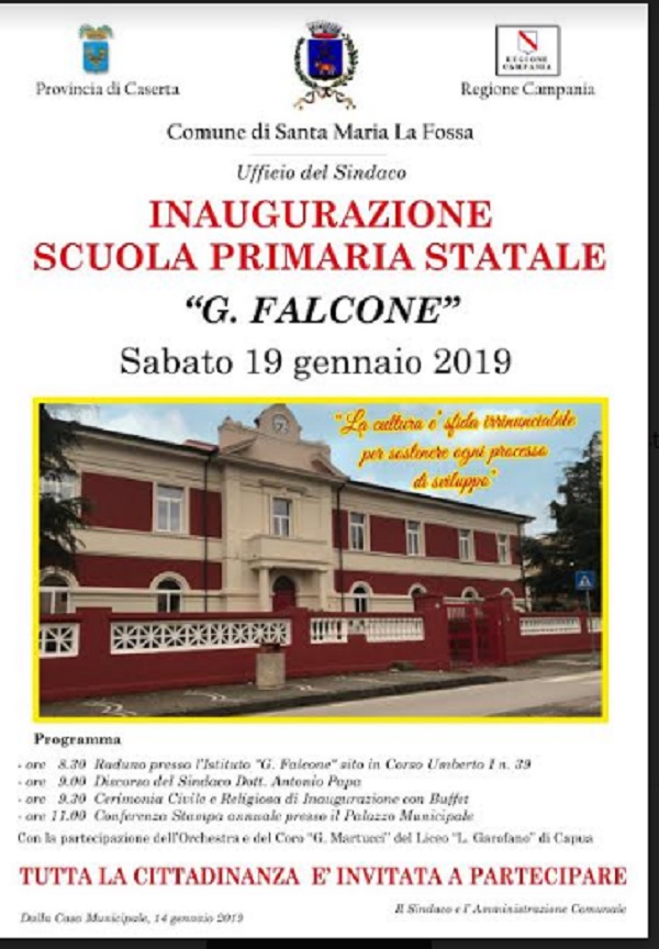 Si svolgerà sabato 19 gennaio a partire dalle ore 8.20 l'inaugurazione della Scuola Primaria Statale 'G.Falcone' in Corso Umberto I a Santa Maria La Fossa.