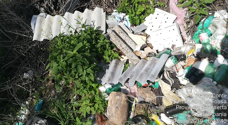"Nel pomeriggio di mercoledi durante un vedettaggio ambientale effettuato dai volontari dell’Associazione D.E.A , effettuato in agro del territorio di Santa Maria la Fossa (CE) a pochi passi dalla ... , venivano individuati numerosi pezzi rotti di lastre in fibrocemento in verosimile amianto, inoltre indumenti, mobilio, materiali plastici, alcuni contenitori alveolati, un cartone di alimenti aiuto UE e sfalci di potature."