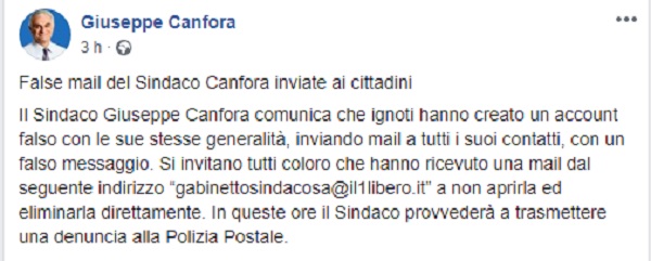 Questo il post pubblicato sulla pagina fb uffficiale del Sindaco di Sarno Giuseppe Canfora.