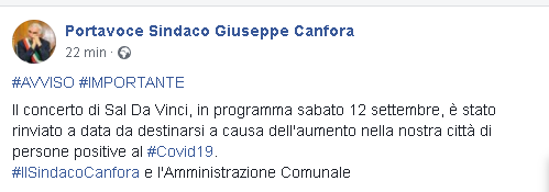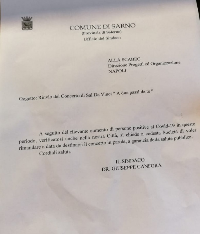 Lo apprendamo dalla pagina Facebook del Portavoce del Sindaco di Sarno, Giuseppe Canfora.