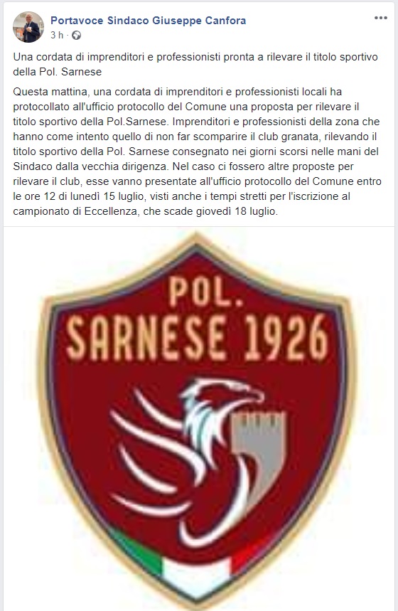 La notizia è stata comunicata dal Portavoce del Sindaco di Sarno Giuseppe Canfora attraverso il proprio profilo FB