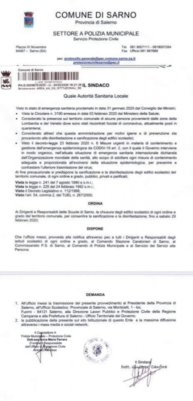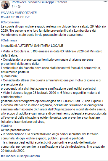 "Le scuole di ogni ordine e grado resteranno chiuse fino a sabato 29 febbraio 2020. Tre persone e le loro famiglie provenienti dalla Lombardia e dal Veneto sono state poste in via precauzionale in quarantena.