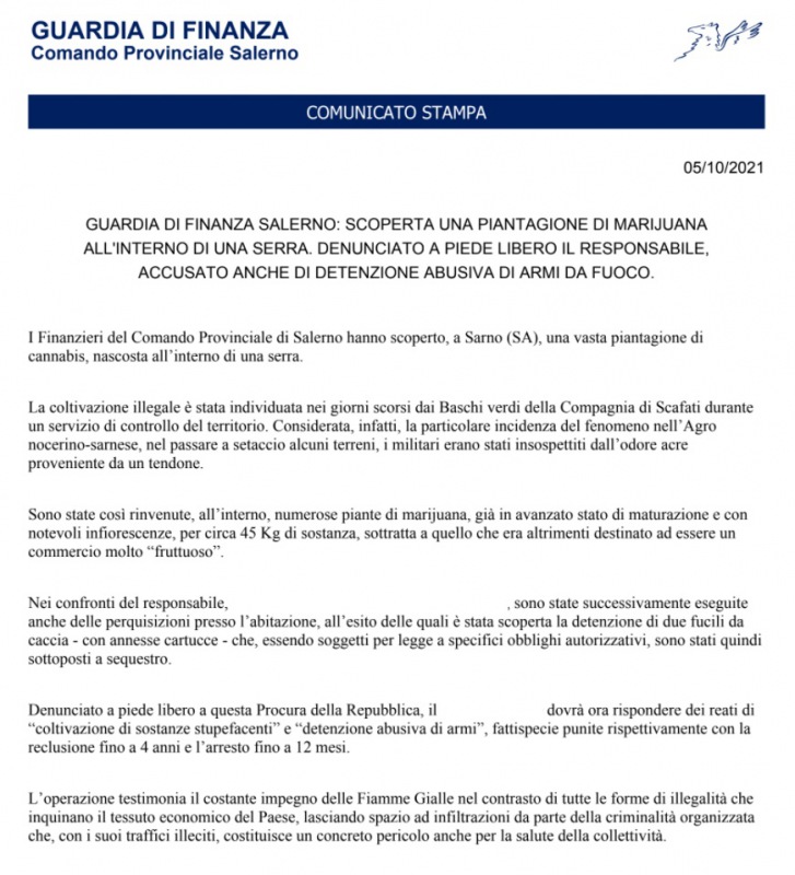 "I Finanzieri del Comando Provinciale di Salerno hanno scoperto, a Sarno (SA), una vasta piantagione di cannabis, nascosta all’interno di una serra. La coltivazione illegale è stata individuata nei giorni scorsi dai Baschi verdi della Compagnia di Scafati durante un servizio di controllo del territorio. Considerata, infatti, la particolare incidenza del fenomeno nell’Agro nocerino-sarnese, nel passare a setaccio alcuni terreni, i militari erano stati insospettiti dall’odore acre proveniente da un tendone. -Si legge nella nota- Sono state così rinvenute, all’interno, numerose piante di marijuana, già in avanzato stato di maturazione e con notevoli infiorescenze, per circa 45 Kg di sostanza, sottratta a quello che era altrimenti destinato ad essere un commercio molto “fruttuoso”. Nei confronti del responsabile, ... , sono state successivamente eseguite anche delle perquisizioni presso l’abitazione, all’esito delle quali è stata scoperta la detenzione di due fucili da caccia - con annesse cartucce - che, essendo soggetti per legge a specifici obblighi autorizzativi, sono stati quindi sottoposti a sequestro. -Si legge nella nota- Denunciato a piede libero a questa Procura della Repubblica, il ... dovrà ora rispondere dei reati di “coltivazione di sostanze stupefacenti” e “detenzione abusiva di armi”, fattispecie punite rispettivamente con la reclusione fino a 4 anni e l’arresto fino a 12 mesi. L’operazione testimonia il costante impegno delle Fiamme Gialle nel contrasto di tutte le forme di illegalità che inquinano il tessuto economico del Paese, lasciando spazio ad infiltrazioni da parte della criminalità organizzata che, con i suoi traffici illeciti, costituisce un concreto pericolo anche per la salute della collettività."
