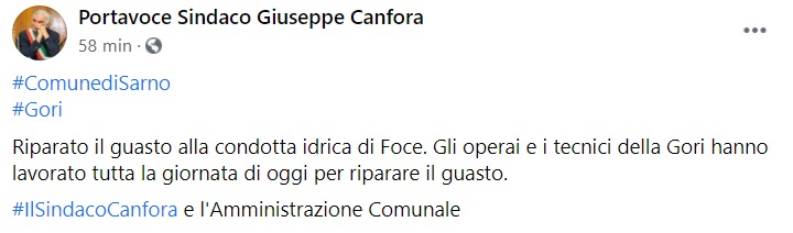 "#ComunediSarno #Gori. Riparato il guasto alla condotta idrica di Foce. Gli operai e i tecnici della Gori hanno lavorato- si legge nella nota- tutta la giornata di oggi per riparare il guasto. #IlSindacoCanfora e l'Amministrazione Comunale"