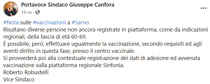 Questo quanto apprendiamo dalla pagina fb del Portavoce del Sindaco di Sarno: "Nota sulle vaccinazioni a Sarno Risultano diverse persone non ancora registrate in piattaforma, come da indicazioni regionali, della fascia di età 60-69. È possibile, però, effettuare ugualmente la vaccinazione - si legge nella nota -, secondo requisiti ed agli aventi diritto in questa fase, presso il centro vaccinale. Si provvederà poi alla contestuale registrazione dei dati di adesione ed avvenuta vaccinazione sulla piattaforma regionale Sinfonia. Roberto Robustelli Vice Sindaco".
