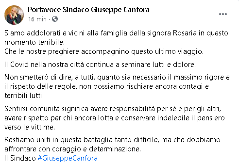 "Siamo addolorati e vicini alla famiglia della signora Rosaria in questo momento terribile. Che le nostre preghiere accompagnino questo ultimo viaggio. Il Covid nella nostra città continua a seminare lutti e dolore. Non smetterò di dire, a tutti, quanto sia necessario il massimo rigore e il rispetto delle regole, non possiamo rischiare ancora contagi e terribili lutti. Sentirsi comunità significa avere responsabilità per sé e per gli altri, avere rispetto per chi ancora lotta e conservare indelebile il pensiero verso le vittime. Restiamo uniti in questa battaglia tanto difficile, ma che dobbiamo affrontare con coraggio e determinazione."