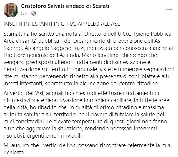 Questo quanto apprendiamo dalla pagina fb del Sindaco di Scafati: "INSETTI INFESTANTI IN CITTÀ, APPELLO ALL’ASL Stamattina ho scritto una nota al Direttore dell’U.O.C. Igiene Pubblica – Area di sanità pubblica - del Dipartimento di prevenzione dell’Asl Salerno, Arcangelo Saggese Tozzi, indirizzata per conoscenza anche al Direttore generale dell’Azienda, Mario Iervolino, chiedendo che - si legge nella nota - vengano predisposti ulteriori trattamenti di disinfestazione e derattizzazione sul territorio comunale, viste le numerose segnalazioni che mi stanno pervenendo rispetto alla presenza di topi, blatte e altri insetti infestanti, soprattutto in alcune zone del centro cittadino. Ai vertici dell’Asl, ai quali ho chiesto di effettuare i trattamenti di disinfestazione e derattizzazione in maniera capillare, in tutte le aree della città, ho ribadito che, in qualità di primo cittadino e massima autorità sanitaria sul territorio - si legge nella nota -, ho il dovere di tutelare la salute dei miei concittadini. Le elevate temperature di questi giorni non fanno altro che aggravare la situazione, rendendo necessari interventi risolutivi, urgenti e non rinviabili. Mi auguro che i vertici dell’Asl possano riscontrare celermente la mia richiesta."