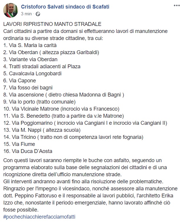 Questo quanto apprendiamo dalla pagina facebook del Sindaco Salvati: