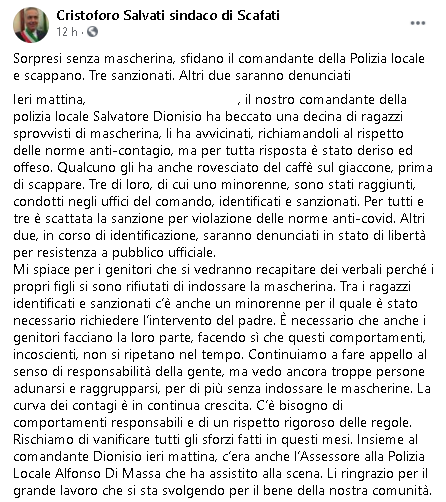 Ieri mattina, in ..., il nostro comandante della polizia locale Salvatore Dionisio ha beccato una decina di ragazzi sprovvisti di mascherina, li ha avvicinati, richiamandoli al rispetto delle norme anti-contagio, ma per tutta risposta è stato deriso ed offeso. Qualcuno gli ha anche rovesciato del caffè sul giaccone, prima di scappare. Tre di loro, di cui uno minorenne, sono stati raggiunti, condotti negli uffici del comando, identificati e sanzionati. Per tutti e tre è scattata la sanzione per violazione delle norme anti-covid. Altri due, in corso di identificazione, saranno denunciati in stato di libertà per resistenza a pubblico ufficiale. Mi spiace per i genitori che si vedranno recapitare dei verbali perché i propri figli si sono rifiutati di indossare la mascherina. Tra i ragazzi identificati e sanzionati c’è anche un minorenne per il quale è stato necessario richiedere l’intervento del padre. È necessario che anche i genitori facciano la loro parte, facendo sì che questi comportamenti, incoscienti, non si ripetano nel tempo. Continuiamo a fare appello al senso di responsabilità della gente, ma vedo ancora troppe persone adunarsi e raggrupparsi, per di più senza indossare le mascherine. La curva dei contagi è in continua crescita. C’è bisogno di comportamenti responsabili e di un rispetto rigoroso delle regole. Rischiamo di vanificare tutti gli sforzi fatti in questi mesi. Insieme al comandante Dionisio ieri mattina, c’era anche l’Assessore alla Polizia Locale Alfonso Di Massa che ha assistito alla scena. Li ringrazio per il grande lavoro che si sta svolgendo per il bene della nostra comunità."
