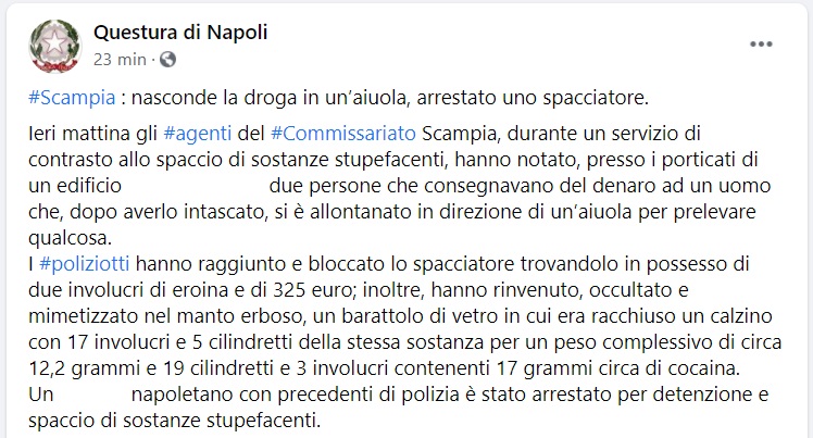 Questo quanto apprendiamo dalla pagina fb della Questura di Napoli: "Scampia: nasconde la droga in un’aiuola, arrestato uno spacciatore.