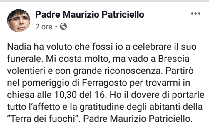 Questo il testo del post apparso sulla pagina fb di Padre Maurizio Patriciello: "Nadia ha voluto che fossi io a celebrare il suo funerale. Mi costa molto, ma vado a Brescia volentieri e con grande riconoscenza. Partirò nel pomeriggio di Ferragosto per trovarmi in chiesa alle 10,30 del 16. Ho il dovere di portarle tutto l’affetto e la gratitudine degli abitanti della “Terra dei fuochi”. Padre Maurizio Patriciello"
